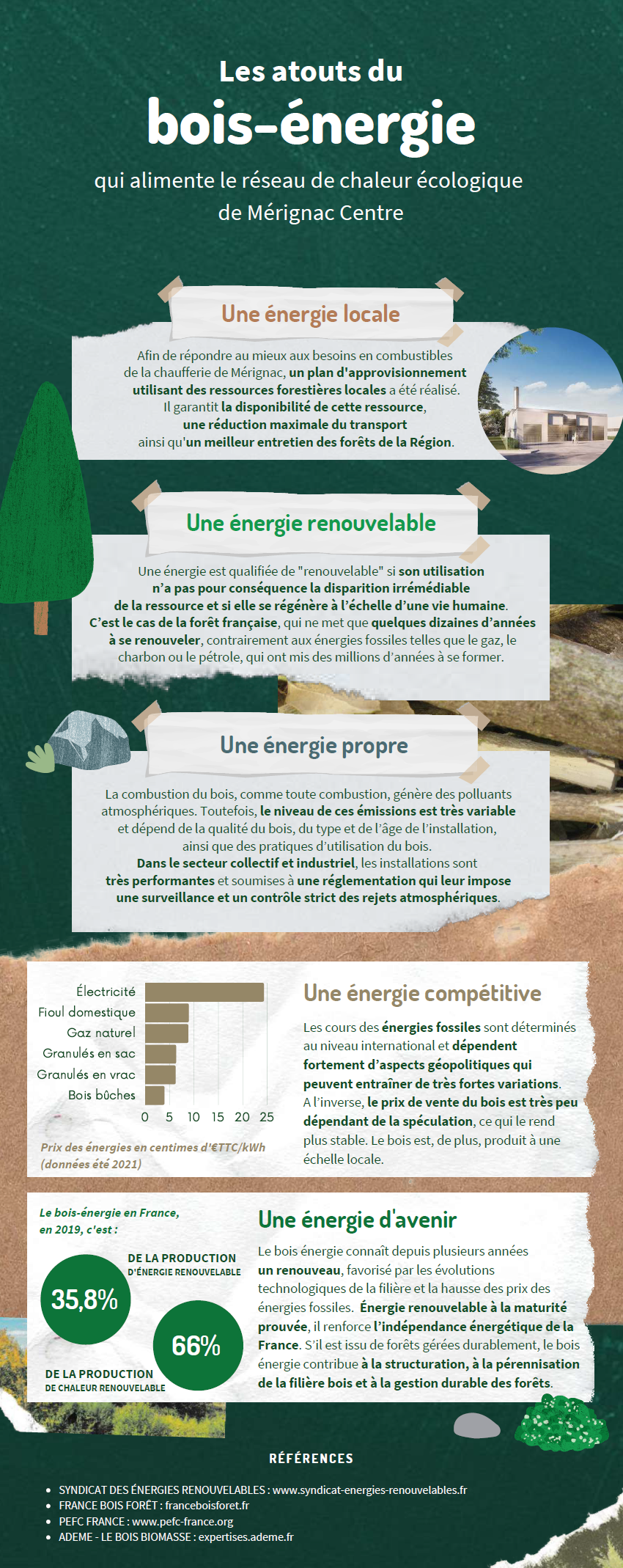 ? Une énergie locale : afin de répondre au mieux aux besoins en combustibles de la chaufferie de Mérignac, un plan d’approvisionnement utilisant des ressources forestières locales a été réalisé. Il garantit la disponibilité de cette ressource, une réduction maximale du transport ainsi qu’un meilleur entretien des forêts de la Région.